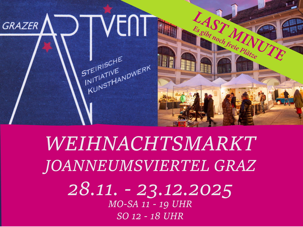 Bereits zum 11. Mal findet im Advent der ARTvent-Markt der STIKH im Lesliehof im Grazer Joanneumsviertel statt. Im Jahr 2025 bieten wir erstmals auch die Möglichkeit, dass du zwischen drei Zeiträumen wählen kannst. Eine Präsenz während zwei Zeiträumen ist ebenso möglich wie eine durchgehende Präsenz (€ 700,-).